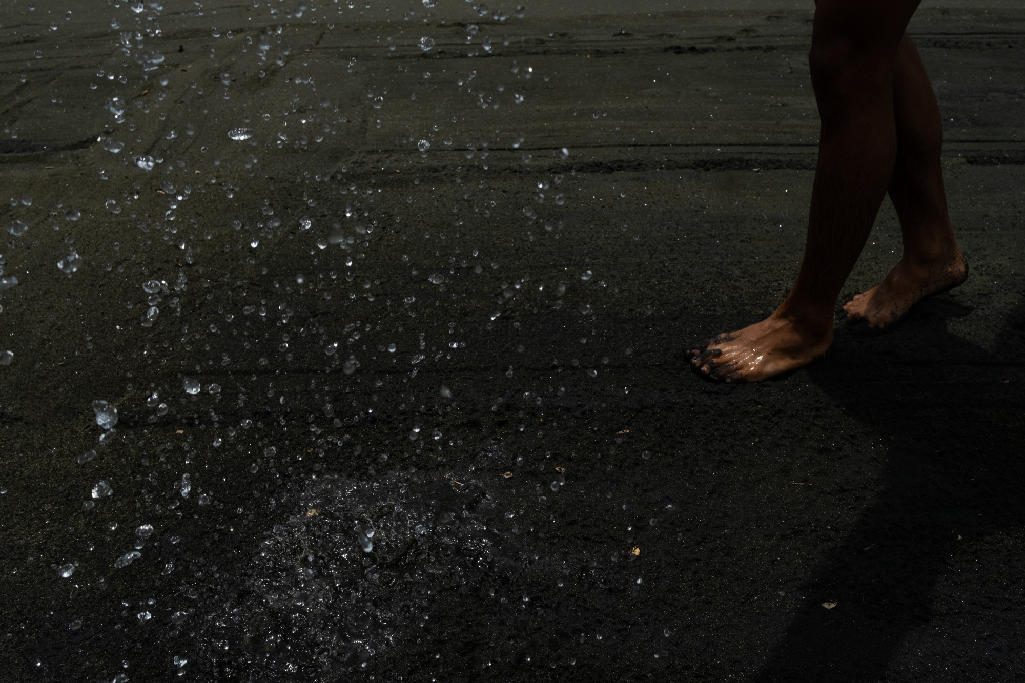 The men in the Noblezada family, Rizalde and his son John, begin production by collecting -seawater over several mornings by submerging a large bamboo pole in the sea. They walk back and forth between the shore and the sea with the pole to sprinkle seawater onto sand.